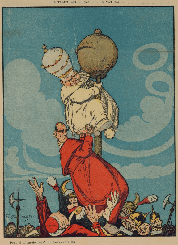 The Pope on a Vatican spire is not so odd once you’ve seen this cartoon of the first radio transmitter installed in the Vatican. (L’Asino, Rome, 1908)