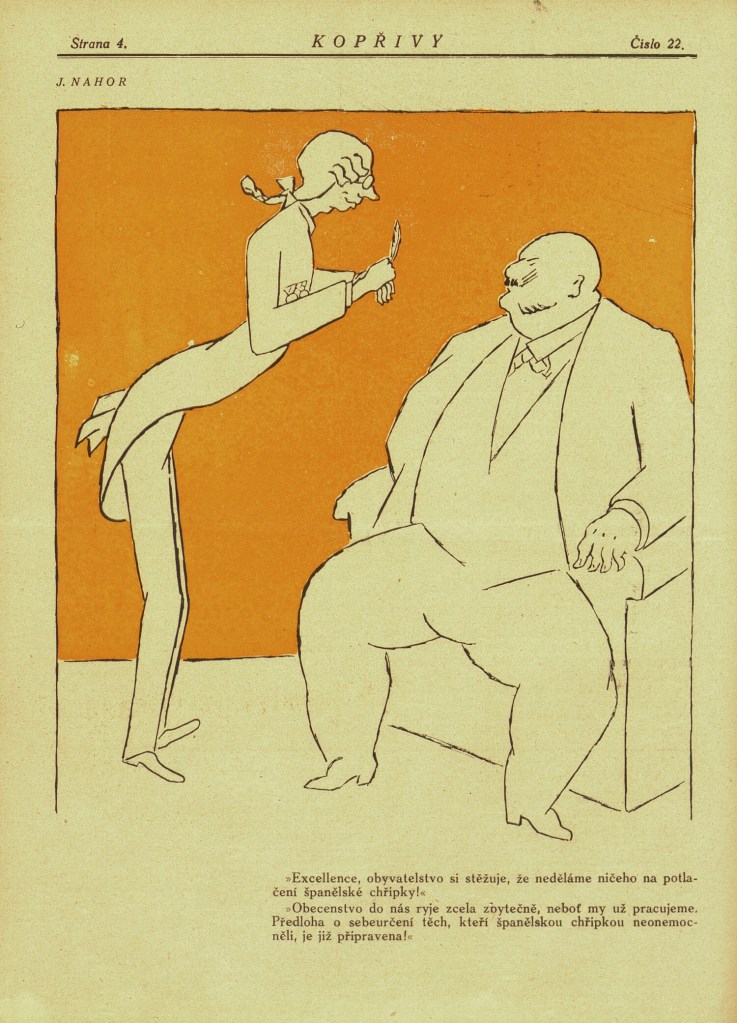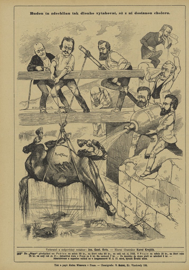 This is an elaborate and slightly intriguing variant on the disease metaphor in politics. Since before the Austro-Hungarian Ausgleich of 1867, Czech nationalists had aspired to a similar agreement with the German-speaking populace in the Bohemian lands. The Old Czech faction pressed repeatedly for a formal list of potential points of agreement (the dead horse labeled “Punktace”), largely centered on a strategy of cooperation with the great landowners and loyalty to the Habsburg monarchy. After 1874 the Young Czech faction rejected this strategy and demanded more direct representation in the parliament, hobbling any compromise. The Old Czechs made a final push for an agreement in 1890, but with the victory of the Young Czechs in the elections the following spring, any prospect for its success faded from view. This cartoon from the Prague satirical journal Šípy in 1892 mocks several Old Czech politicians as they endeavor to lift the dead horse, one applying generous quantities of carbolic acid.