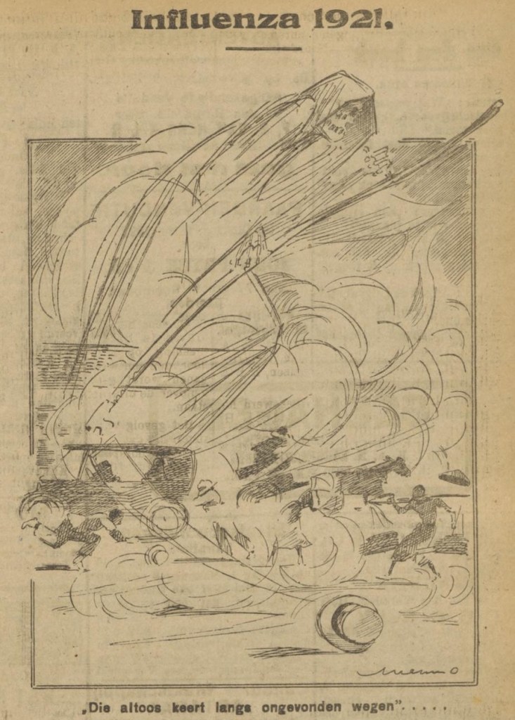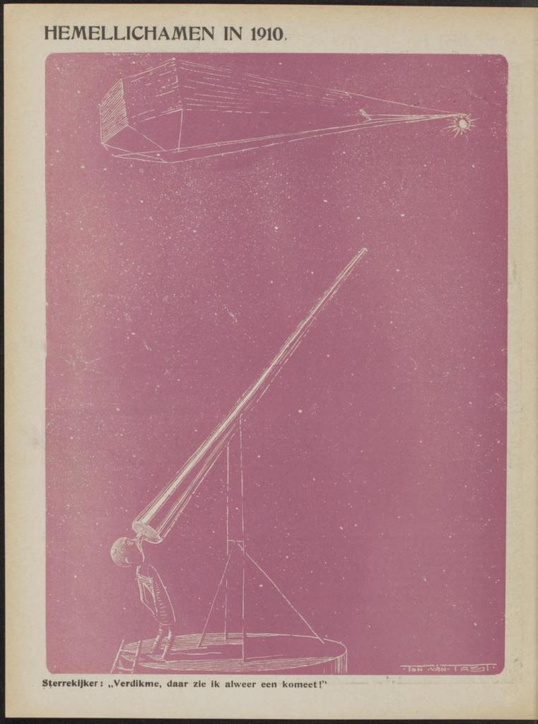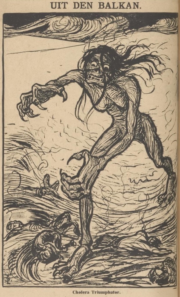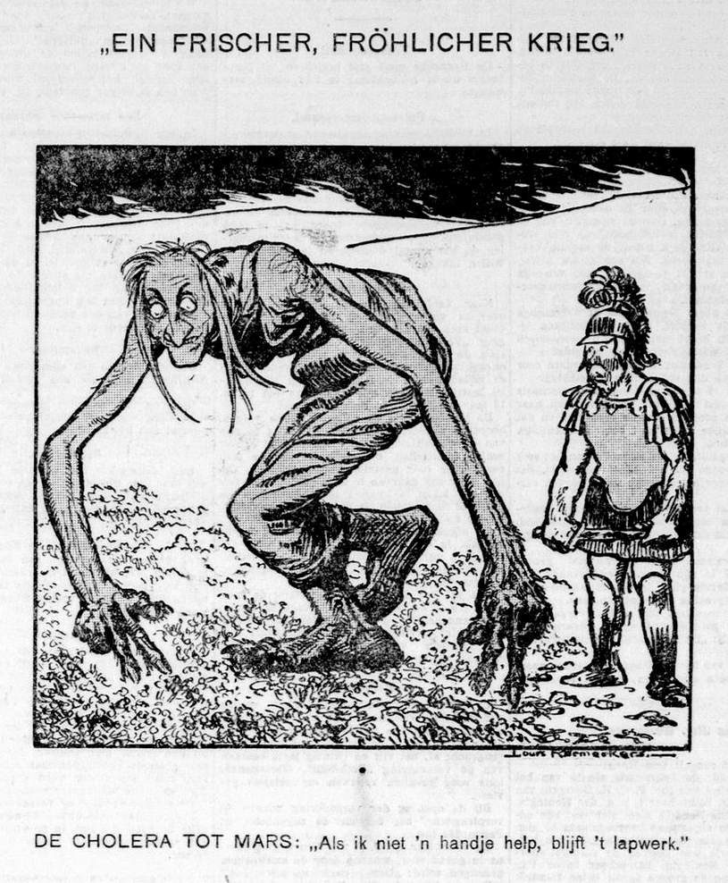 (De ware Jacob, Rotterdam, 1910) (When this cartoon appeared in 1910, the last great cholera pandemic was slowly petering out. Halley’s comet also returned to earthly view that same year, an ill portent for some. In Dutch the word for body in “heavenly body” can also signal “corpse.” See also a Russian cartoon on the Halley’s comet theme.)