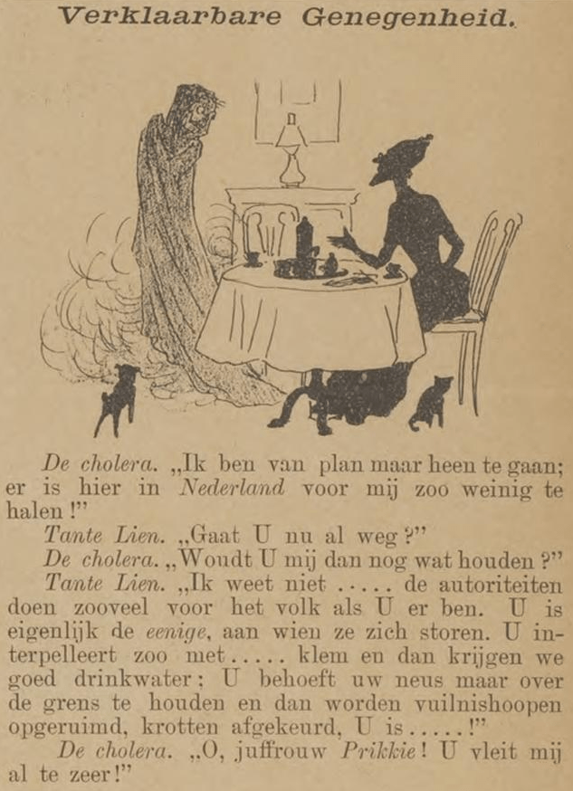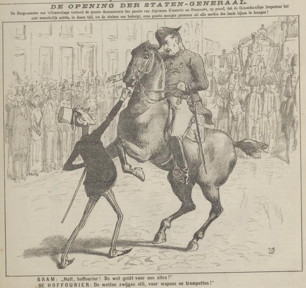 The major of ‘s Gravenhage has forbidden a large demonstration for Universal Suffrage and Voting Rights on the grounds that the Medical Inspector did not consider it desirable, at this time when cholera threatens us, to gather a great multitude of persons from all parts of the country!