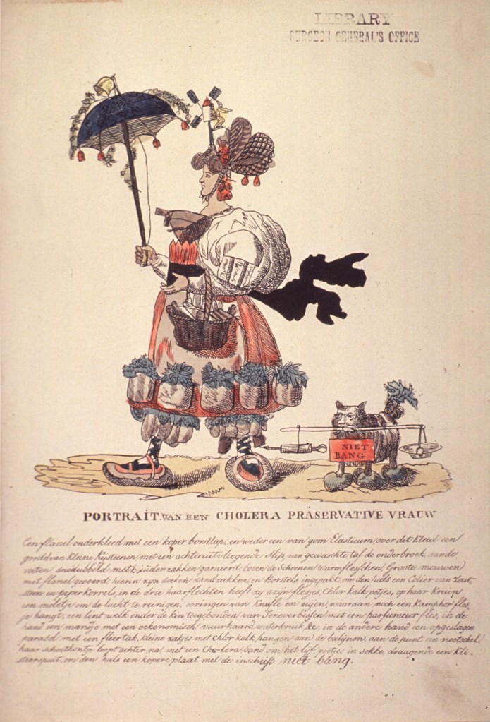 An undated drawing (probably 1830s) available at the National Libary of Medicine. This would appear to be a Dutch version of a German print by Peter Carl Geissler. See also the Portrait of a man protected against cholera.