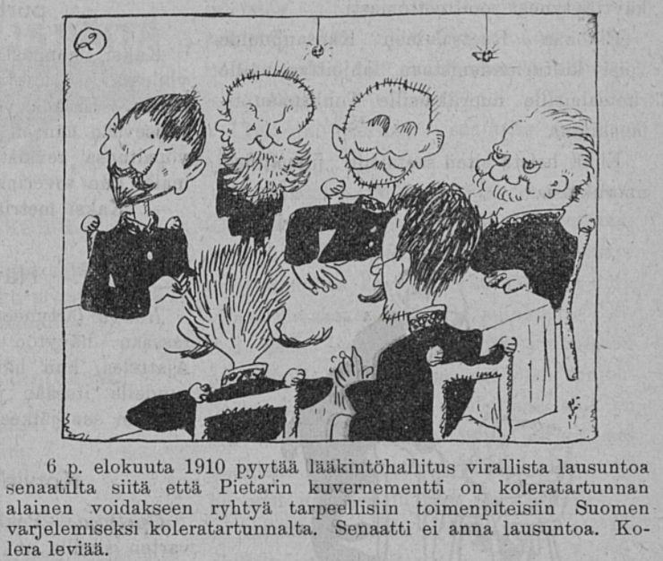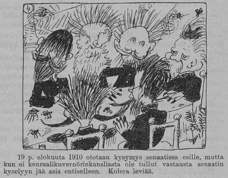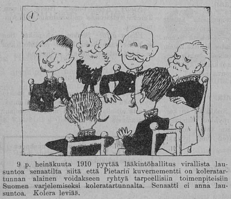A Finnish cartoon from 1910 mocking the inaction of the Russian Imperial government during a cholera epidemic. (Tuulispää)
