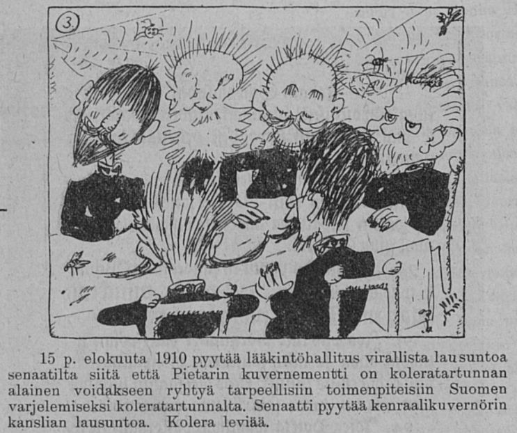 First panel: “On July 9, 1910, the Medical Board issued an official statement from the Senate that the St. Petersburg District was under cholera infection, in order to be able to take the necessary measures to protect Finland from cholera infection. The Senate does not issue an opinion. Cholera spreads.”