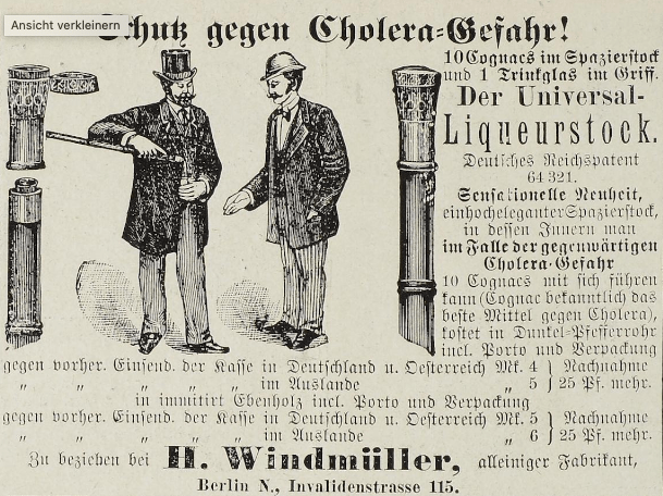 If you are anxious about venturing out in these pandemic times, may I suggest Mr. Windmüller’s “highly elegant” Liquor Cane (German patent 64321), which holds ten shots of cognac to protect you against disease. (Meggendorfers Humoristische Blätter, 1892)