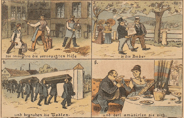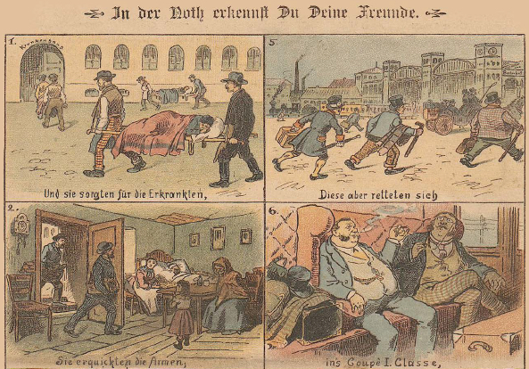 From Der wahre Jacob no. 162, Stuttgart, 1892: 1. And they cared for the sick, 2. they comforted the afflicted, 3. they cleaned the infected courtyards 4. and buried the dead. 5. Yet these saved themselves 6. in first class, 7. in the spas 8. and enjoyed themselves there.
