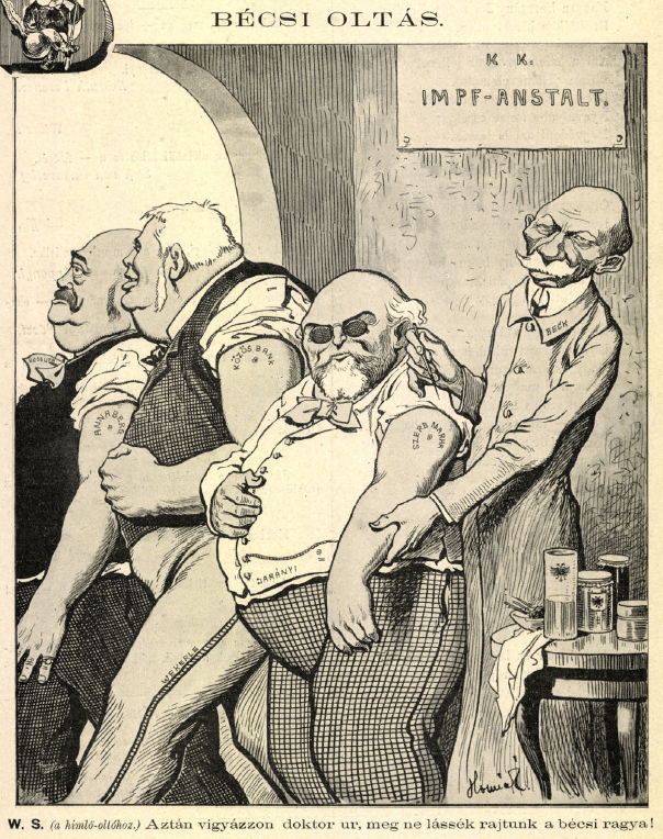 At the Imperial Royal Vaccination Institute [Austrian prime minister Count Max von Beck administering the shots to Hungarian ministers] Hungarian prime minister Sándor Wekerle [second from left] (to the smallpox inoculator) “Take care then, Doctor, we don’t want to be seen with the Viennese pock on us!” (Borsszem Jankó, Budapest, 1907) (The decadal negotiations to renew the 1867 Compromise between the Austrian and Hungarian halves of the Habsburg Empire were exceptionally contentious in 1907. The electoral franchise was broader in Austria than it was in Hungary, and Beck threatened to extend it to the Transleithanian portion of the empire, which would have threatened the ability of Hungarian politicians to control the fractious minorities who slightly outnumbered the Hungarian population. The mark on Minister of Agriculture Ignác Darányi’s shoulder reads “Serbian livestock,” signaling grudging Hungarian accession to a common tariff agreement, while Wekerle’s reads “common bank,” i.e., shared currency.)