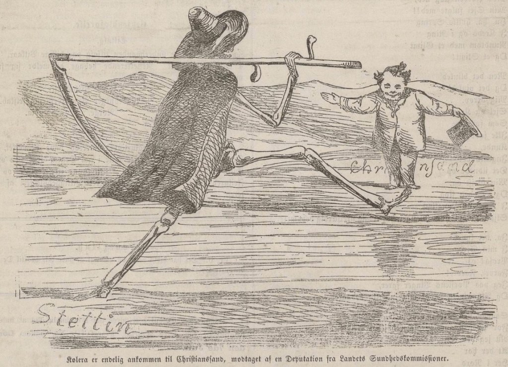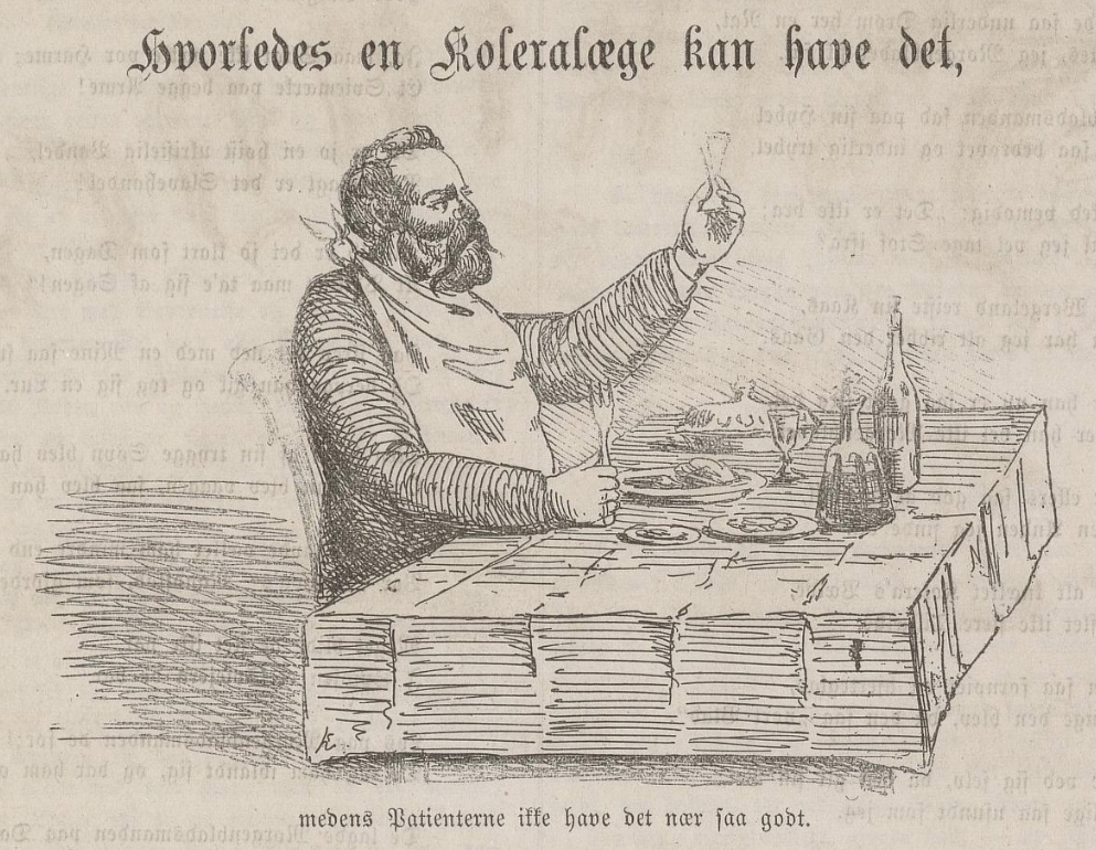 After inspecting Miss Stabell’s farm on Rohdeløkken and thus suiting Morgenbladet [the establishment newspaper], the Public Health Commission sleeps the sleep of the righteous in its armchair without having any idea that cholera is killing thousands of pilgrims in Egypt.