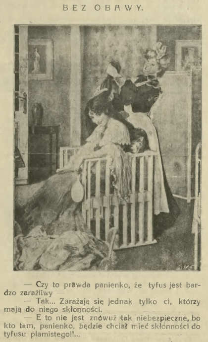 “Is it true, miss, that typhus is contagious?” “Yes… But it infects only those who have a tendency for it.” “And that’s again not so dangerous, because who, miss, would want a tendency for typhus.” (Kogut, Warsaw, 1912)