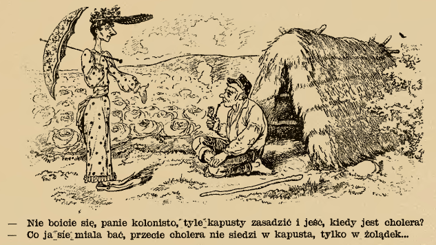 “Mr. Settler, aren’t you afraid to plant and eat so much cabbage when there is cholera?” “What do I have to fear, after all cholera is not in the cabbage, but in the stomach…” (Mucha, Warsaw, 1892)