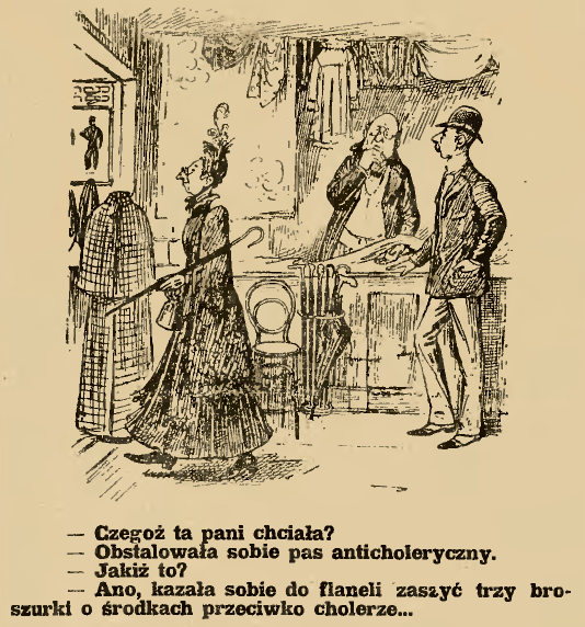 “What did that lady want?” “She arranged for an anti-cholera waistband.” “What is that?” “Well, she ordered three brochures on anti-cholera measures sewn into the fabric…” (Mucha, Warsaw, 1892)
