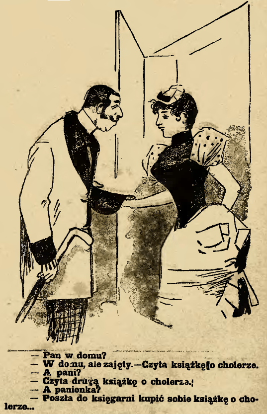 “Is the man of the house at home?” “He’s at home, but he’s busy. He’s reading a book about cholera.” “And the lady?” “She’s reading another book about cholera.” “And mademoiselle?” “I’m off to the bookstore to buy myself a book about cholera…” (Mucha, Warsaw, 1892)