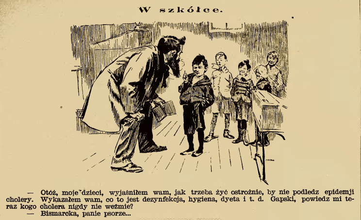 “Well, my children, I explained to you how to live carefully so as not to be subject to the cholera epidemic. I showed you what disinfection, hygiene, diet, and so on are. Gapski, tell me who the cholera will never take?” “Bismarck, sir…” (Mucha, Warsaw, 1892)