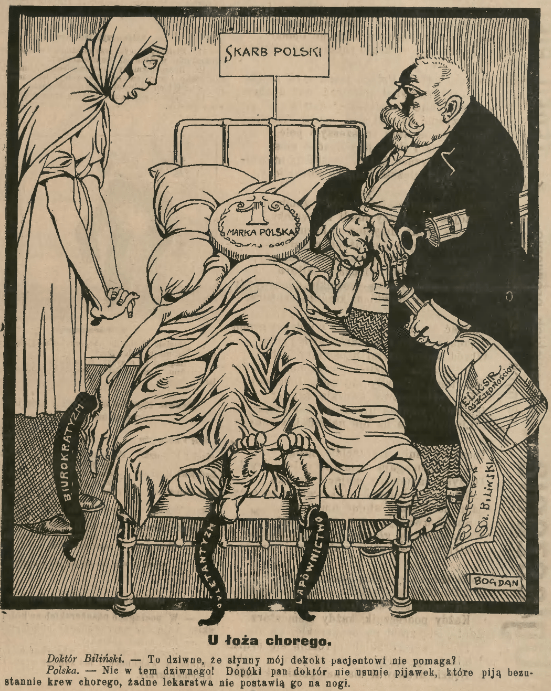 Hospital ward: Polish treasury. Patient: The Polish mark. Doctor Biliński [the Polish finance minister with his austerity elixir]: “Isn’t it strange that my famous decoction is not helping the patient?” Polish woman: “No wonder! Until the doctor removes the leeches [bureaucratism, dilettantism, bribery] that constantly drink the patient’s blood, no medicine will put him on his feet.” (Mucha, Warsaw, 1919)