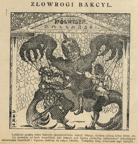 Balkan peninsula. “Humanity is oppressed by various infectious bacteria: plague, cholera, typhus, yellow fever, etc. But worse than all these is the bacillus called bacillus germanicus, which constantly provokes hatred and militant sentiments around the world. Here we provide an image of this bacillus.” (Kogut, Warsaw, 1910)