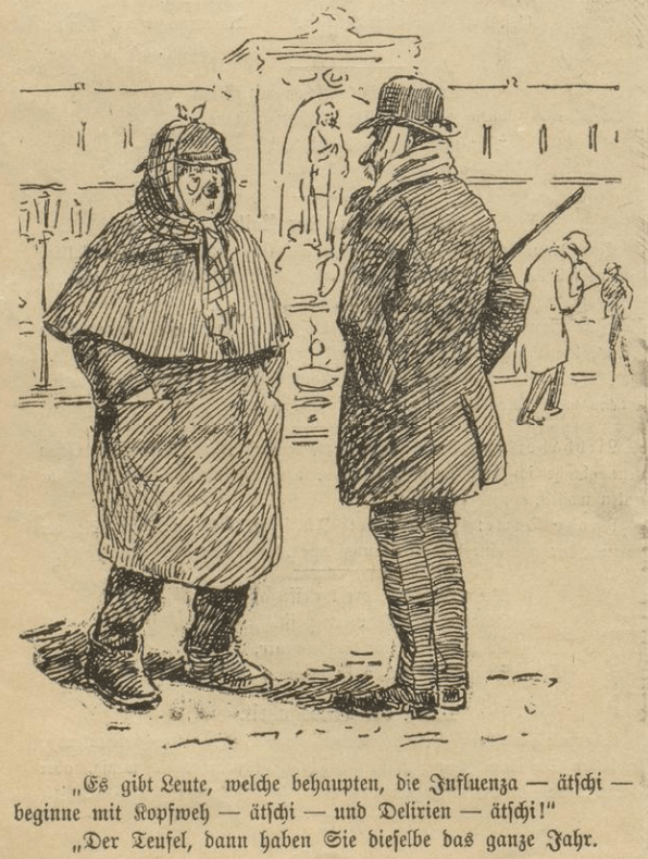 “There are people who claim that influenza (achoo!) starts with a headache (achoo!) and delirium (achoo!).”