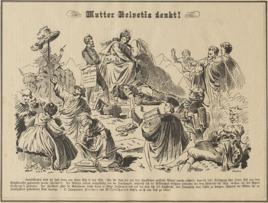 (The fancy hat at upper left is labeled “obligatory vaccination.” The gentleman standing before Mother Helvetia carries the vaccination law.)