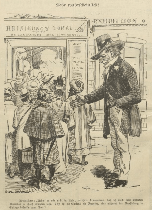 Brother Jonathan [the icon did not fully stabilize under “Uncle Sam” until World War I]: “Don’t be angry with me, dear immigrants, for having you fumigated so severely as you enter America. Right now cholera is the excuse, but then it will improve during the exhibition in Chicago!”