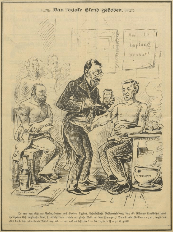 A physician injecting small quantities of meat extract: “Since we can now inoculate away via its own poison, not only smallpox, but also cholera, typhus, consumption, brain inflammation, in short, all bad diseases, we simply proceed in the same manner with hunger, thirst, and lack of money, inoculate it away via the corresponding medium and — who would deny it? — the social question is solved.”